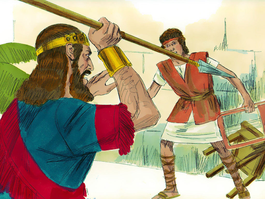 The next day an evil spirit from God came forcefully on Saul. He was prophesying in his house, while David was playing the lyre, as he usually did. Saul had a spear in his hand and he hurled it, saying to himself, “I’ll pin David to the wall.” But David eluded him twice.