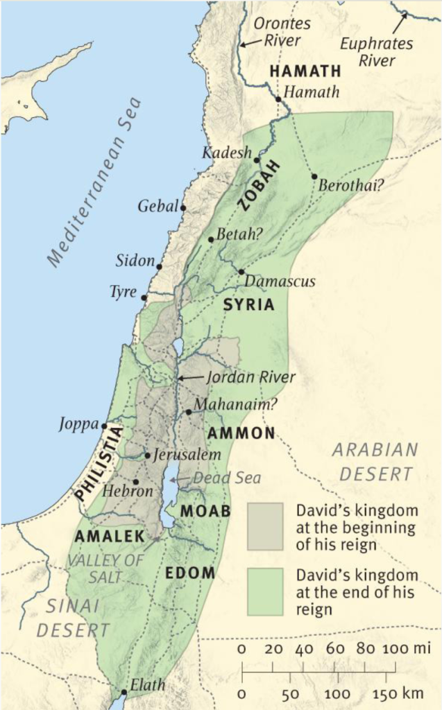 Towards the north, David took control of the region of Zobah when the king had gone off to take control of the region surrounding the Euphrates river. This perhaps weakened their army back home and gave David an opportunity to invade the kingdom of Hadadezer (2 Samuel 8:3). When the Arameans (Syrians) came to the aid of their neighbours, David’s army overpowered them as well and installed outposts in their cities.