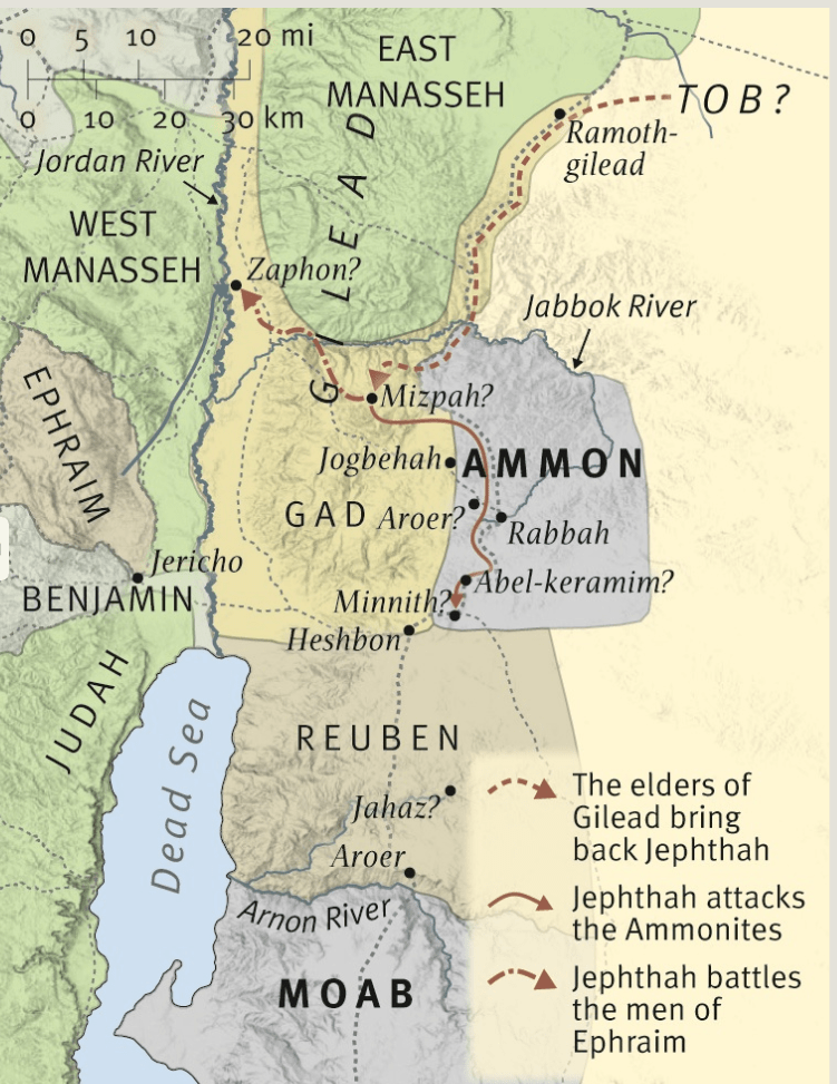 God works in strange ways as the next leader of Israel was not even allowed to be among his people during his formative years. He was driven away to live in the wilderness of Tob where he associated himself with evil men. If the sons of Gilead feared a repetition of the Abimelek story, then they were almost halfway there, as just like Abimelek, Jephthah had his own private army of unscrupulous men willing to do whatever it took to get the job done. Jephthah and his gang of scoundrels would have wreaked havoc as the news of their exploits reached the ears of the Gileadites.